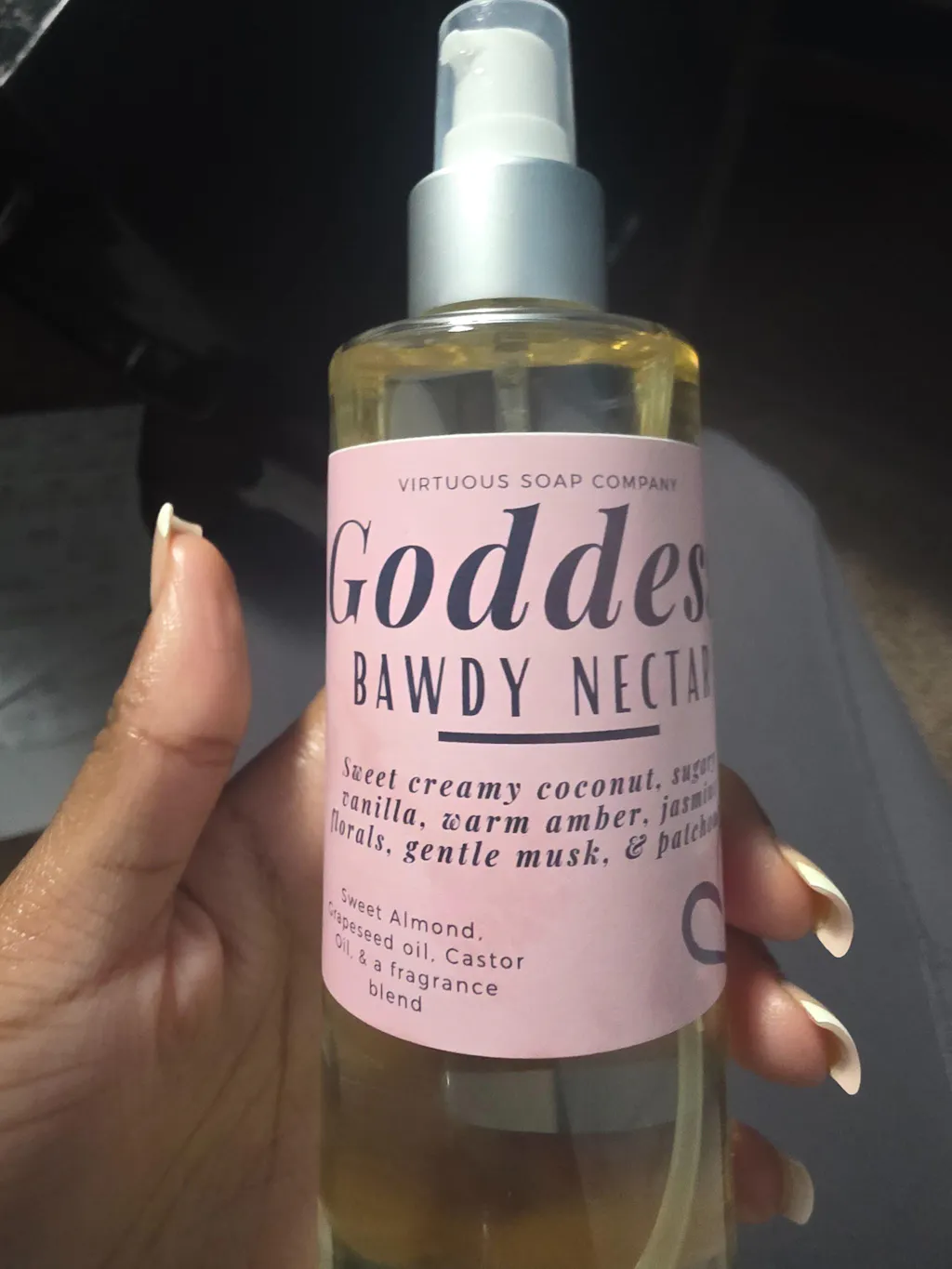 Goddess bawdy nectar features a combination of creamy coconut, sweet vanilla, jasmine, warm amber, and patchouli. This versatile body oil can be enjoyed throughout the year.