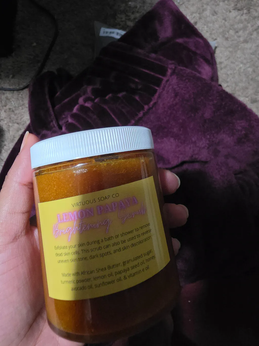 Made with Turmeric, Granulated Sugar, Shea Butter, Mango Butter, Vitamin E, Honey, Kojic Acid, Tee Tree, Coconut Oil, Olive Oil, Grapeseed Oil, Hempseed Oil, Papaya Oil, Lemon Oil, Sweet Orange Oil, and Moringa Oil.